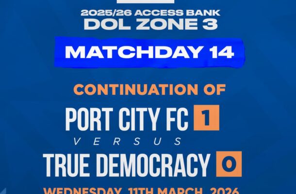 “Following the decision of the Disciplinary Committee regarding the Access Bank Division One League Matchday 14 fixture between Port City and True Democracy, we hereby announce that the game will continue on Wednesday, March 11, 2026 at the Kukurantumi Ohene Ameyaw Park,” the statement said.