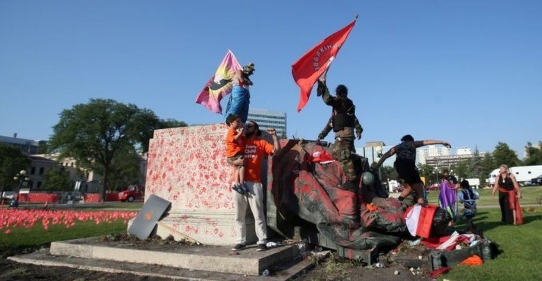 The protesters cheered as the statue at the legislature in Manitoba’s capital Winnipeg was toppled on Thursday.
